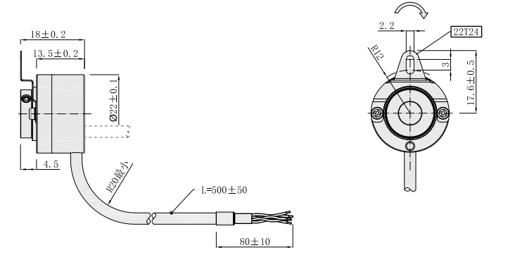 ● 特点:超小型,结构紧凑合理,安装方便● 应用范围:微型电机、小型仪器等自动化控制● 外形尺寸:外径22mm, 厚度为18mm, 轴径4mm;5mm;6mm;6.5mm● 分辨率:可达1600P/R● 电源电压:DC5V;DC8-30V● 防护等级:IP50● 线长:500mm● 重量:35g
