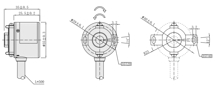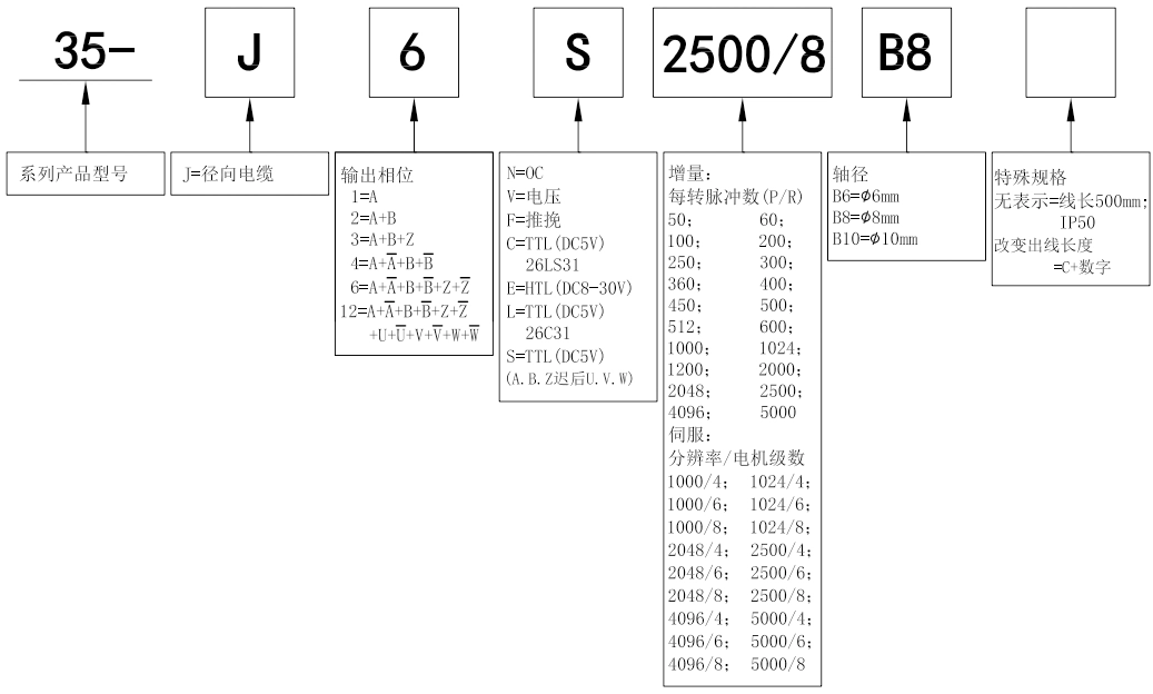 增量式(空心轴,盲孔)● 特 点:体积小,结构紧凑合理,多种输出方式和多种轴径可选● 应用范围:伺服电机、纺织行业、包装机械、小型仪器等工业自动化控制● 外形尺寸:外径35mm,厚度35mm,轴径6mm;8mm;10mm(深度15mm)● 分辨率:可达5000P/R● 电源电压:DC5V;DC8-30V● 防护等级:IP50● 线长:500mm● 重量:约100g