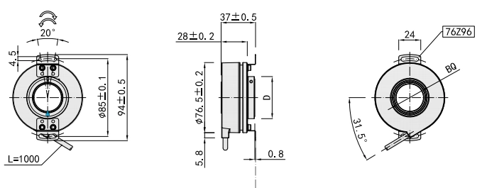 本产品是一款能输出增量和UVW信号、大通孔坚固型编码器,结构紧凑耐用,普遍用于伺服电机、工业自动化领域。● 编码器直径76.5mm、厚度为37mm、轴孔径最大30mm,可选择轴前抱紧安装和轴后抱紧安装;● 环抱式锁紧安装结构;● 采用非接触式光电原理;● 极性反接保护;● 短路保护;● 多种电气接口可选;● 分辨率每周最高可达65536PPR