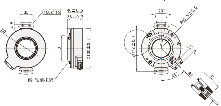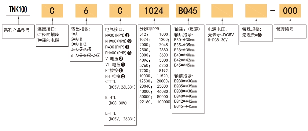 本产品是一款能输出增量信号的贯穿轴编码器,结构紧凑,坚固耐用,普遍用于电机、电梯、数控等工业自动化领域。● 编码器直径Φ100mm、厚度为38mm、轴孔径最大Φ45mm;● 轴前环抱紧或轴后环抱紧两种可选,柔性弹簧板安装;● 采用非接触式光电原理;● 极性反接保护;● 短路保护:● 多种电气接口可选;● 分辨率每周最高可达100000PPR